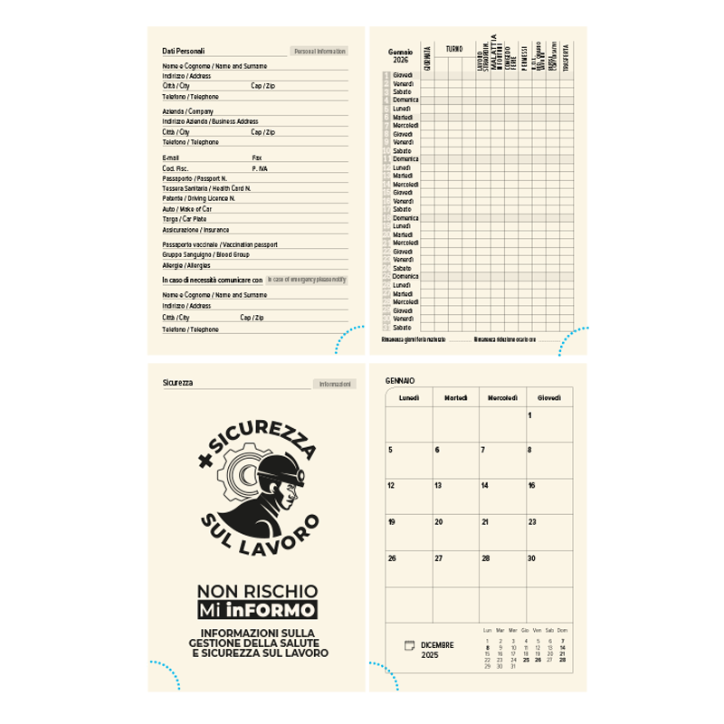 Edizione speciale completa con: turnario del lavoratore, inserto sicurezza del lavoro, memo personale, numeri e informazioni utili.