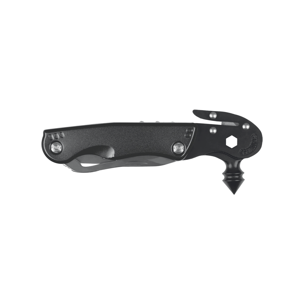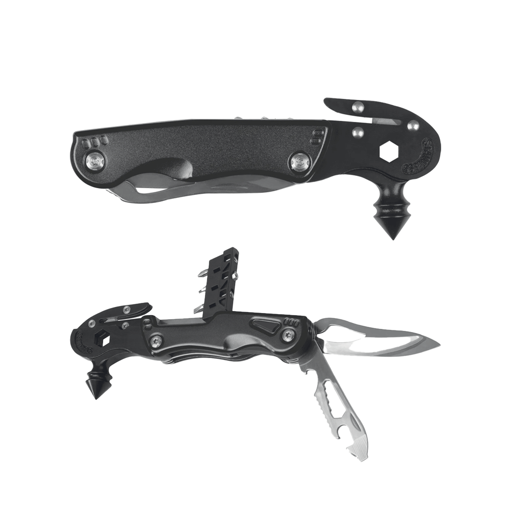 – 8 funzioni di utilità: torcia a led, martello di emergenza, taglia cinture di sicurezza, cacciaviti, coltello apribottiglie, seghetto. chiave inglese