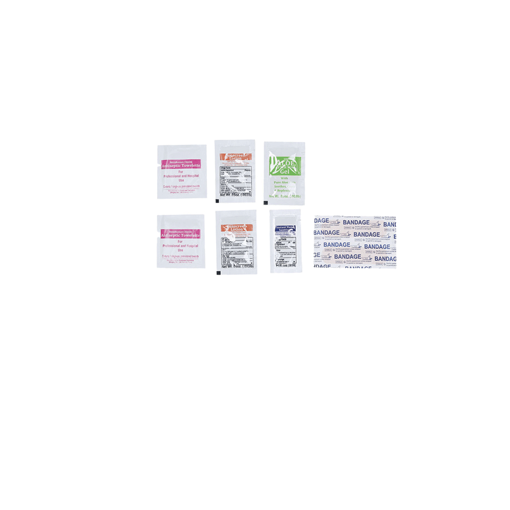 CONTIENE: asciugamano, salviettina, protezione solare spf30, doposole, gel igienizzante, cerotti, bendaggi