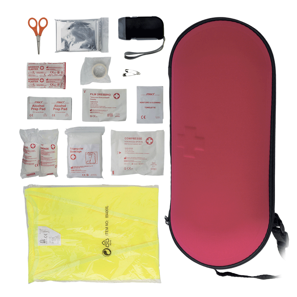 CONTIENE: torcia, coperta in alluminio, 2 spille, forbici, 8 salviette disinfettanti, 15 cerotti, 4 salviette detergenti, 2 garze, nastro sanitario,benda, 2 tamponi/alcol, giubbino di sicurezza