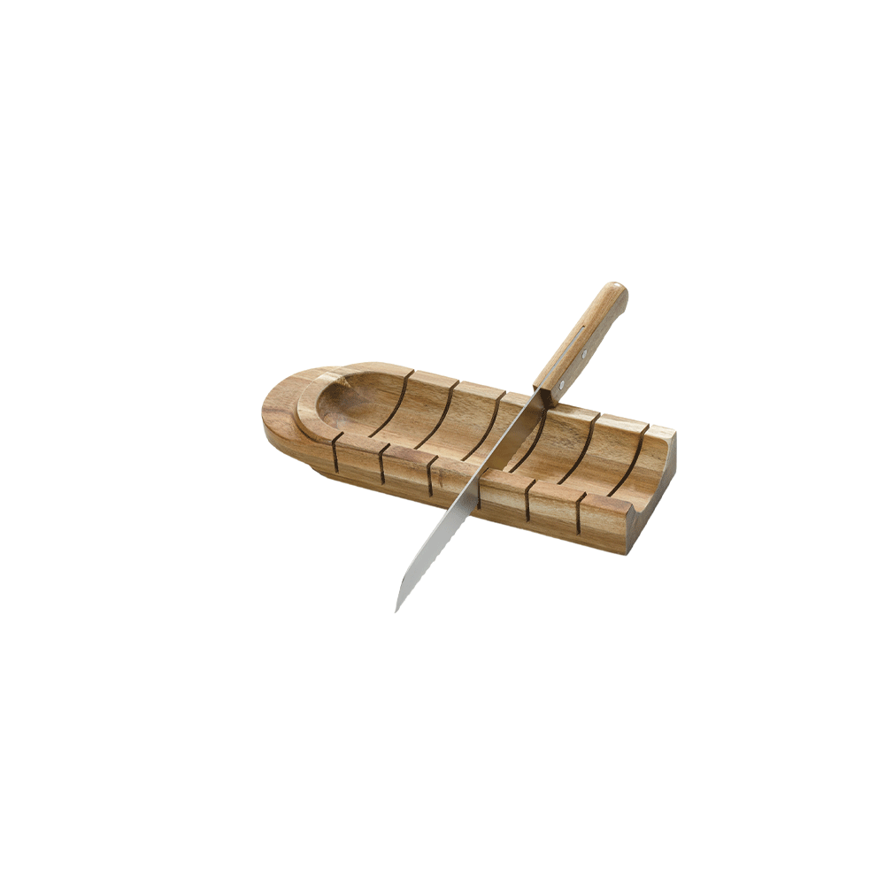 – Tagliere da pane in legno acacia massello con scanalatura per tagliare fette di pane ” perfette” con coltello (formato cm 32 x 3,8 x 10,5)