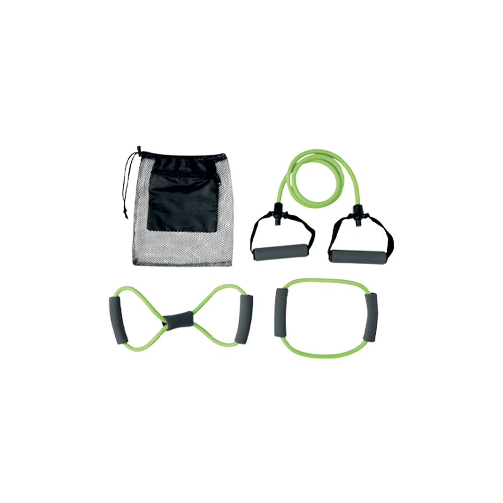 – Set di bande da fitness elasticizzate (3 pezzi di diversa lunghezza), impugnatura in spugna, sacca contenitore in polytex a rete (formato cm 30 x 20)