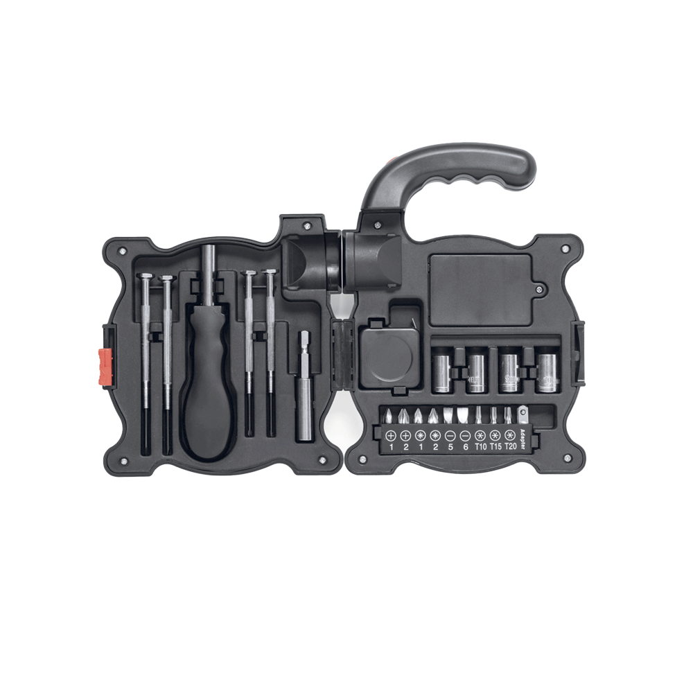 – Contiene: cacciaviti piatti e a croce, manico multifunzione e adattatore, chiavi a bussola, flessometro