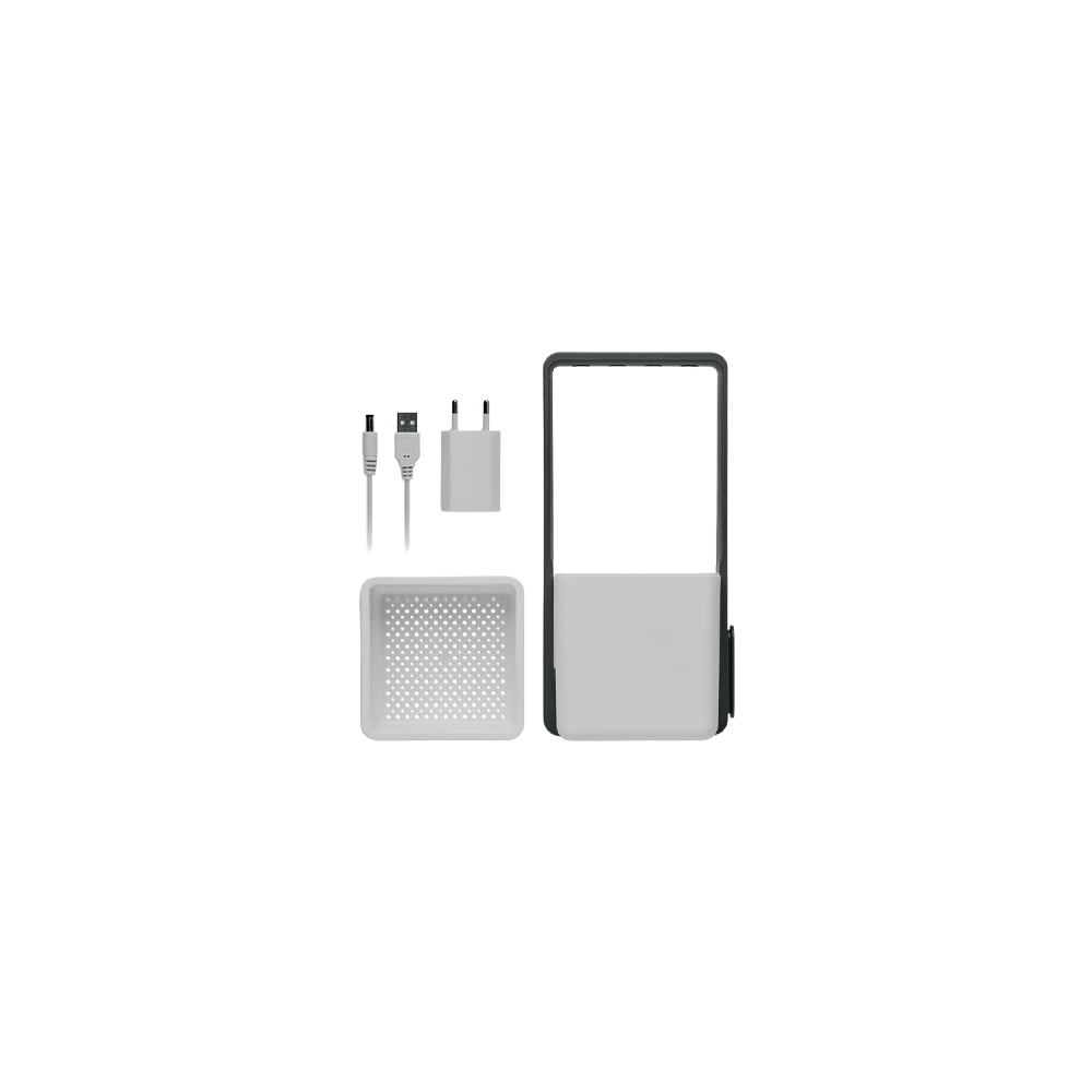 – Inserto manico con impianto luci 4 led growlight, 1 filtro, 1 cavo di ricarica USB, adattatore A/C, ingresso a bassa tensione 85V