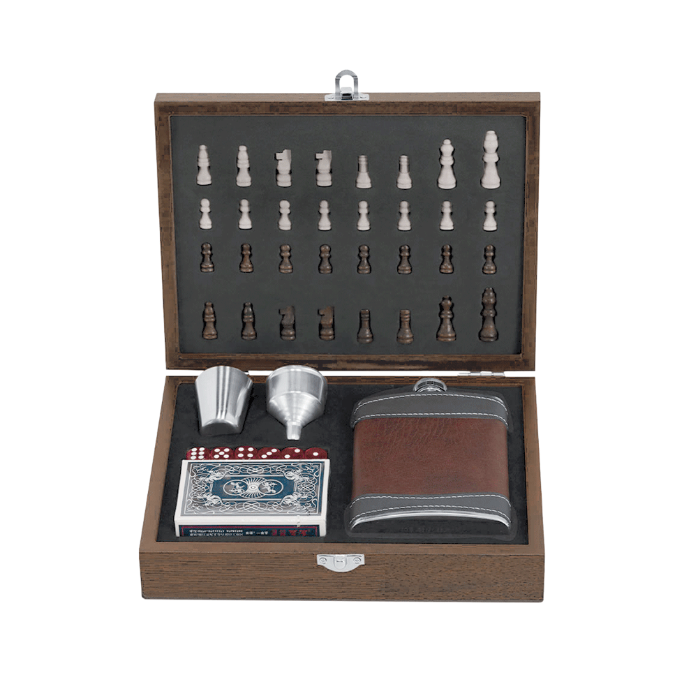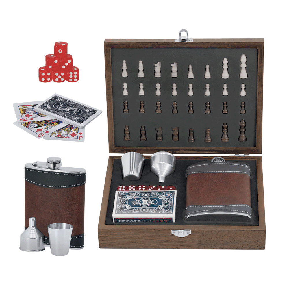 – 32 Scacchi in legno, fiaschetta cap. ml 220, Scacchiera, imbuto, bicchierino, carte da poker, 6 dadi