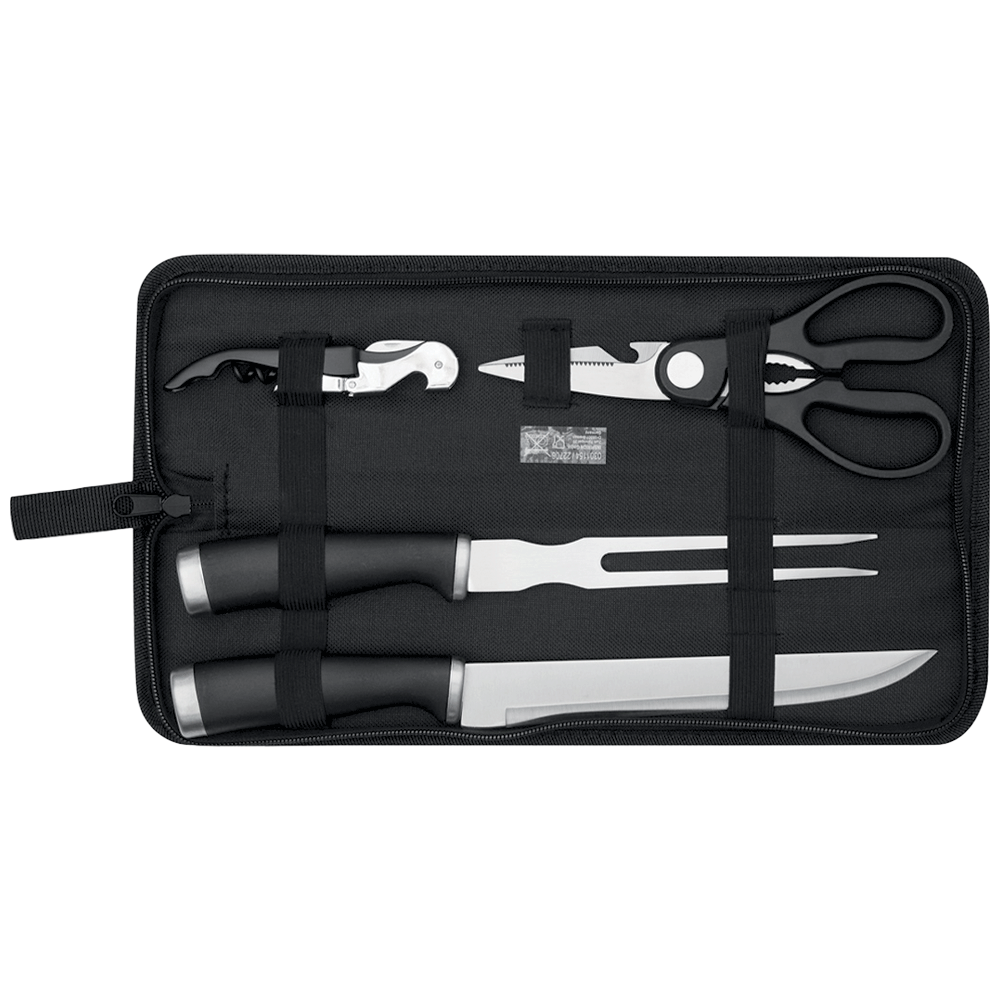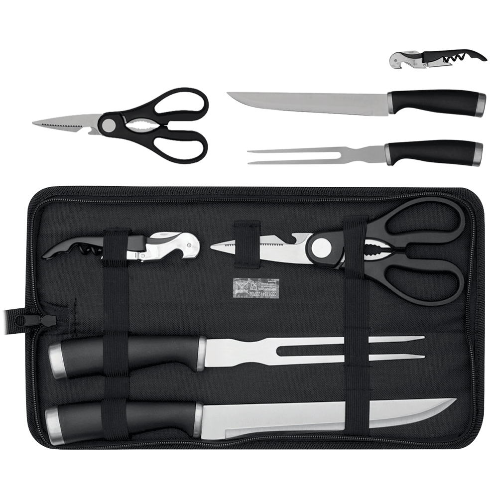 – Coltello da intaglio, forchettone, apribottiglia, forbici/coltello