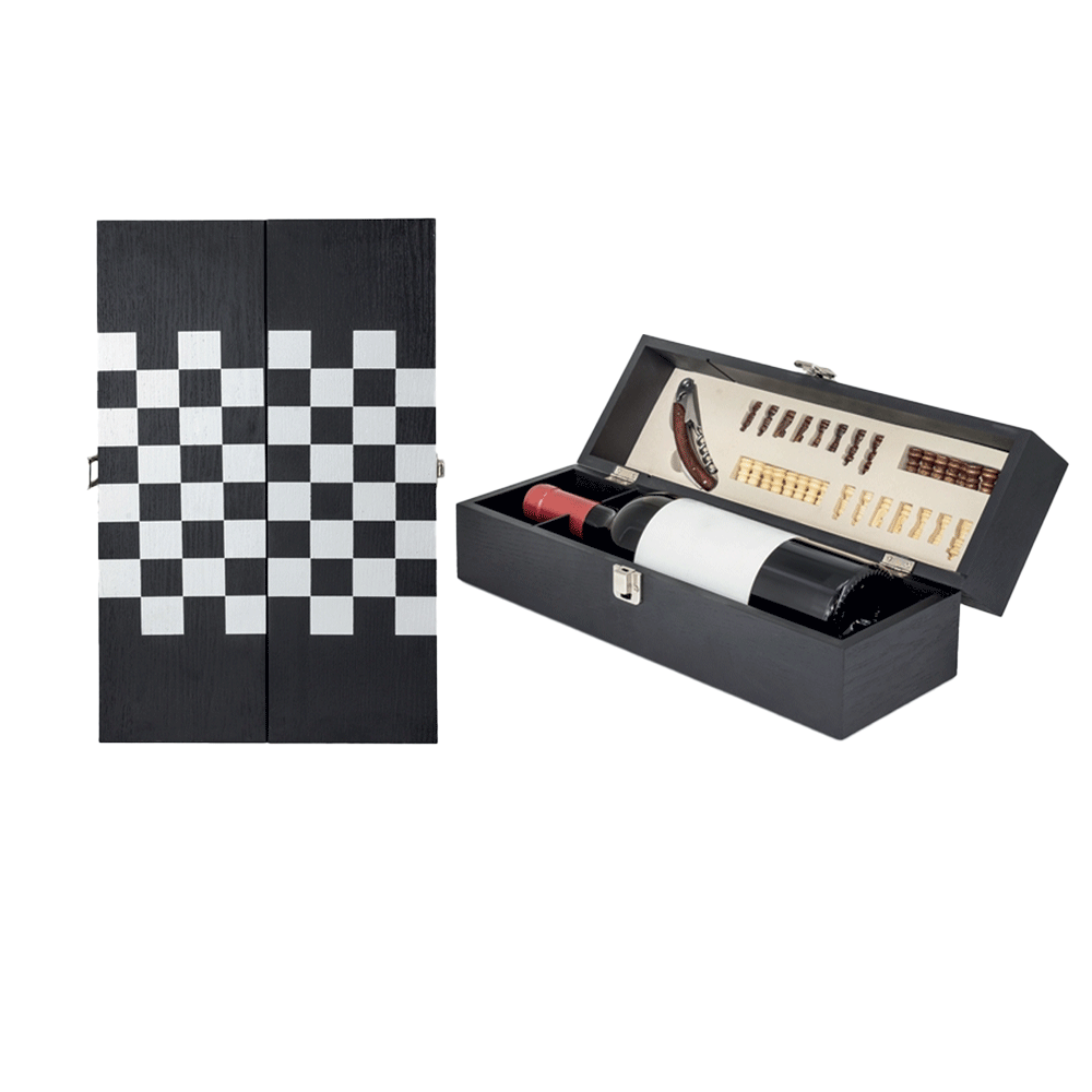 – 1 astuccio contenitore bottiglia in legno con scacchiera, chiusura a clip in metallo e fustella portabottiglia