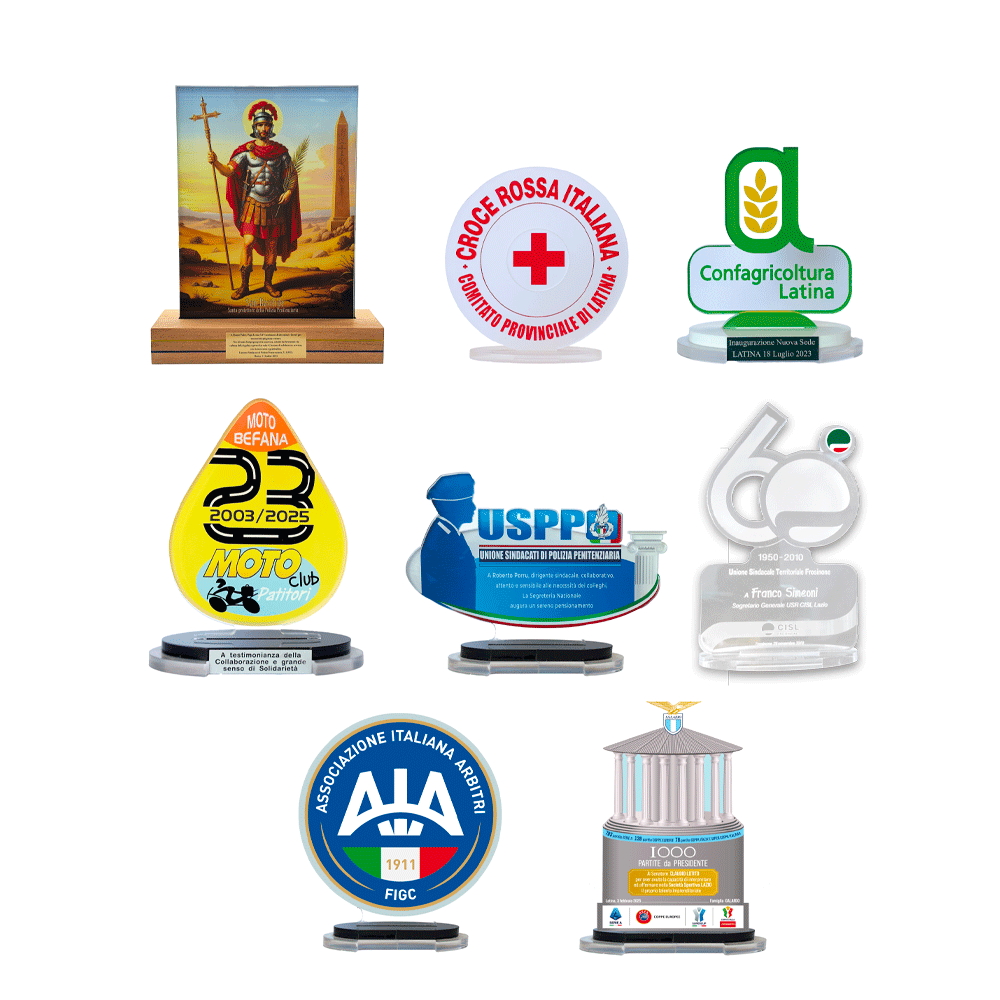 – Materiali utilizzati: plexiglass, vetro, legno naturale, pellami, ABS TECH, metalli, laminati, etc.