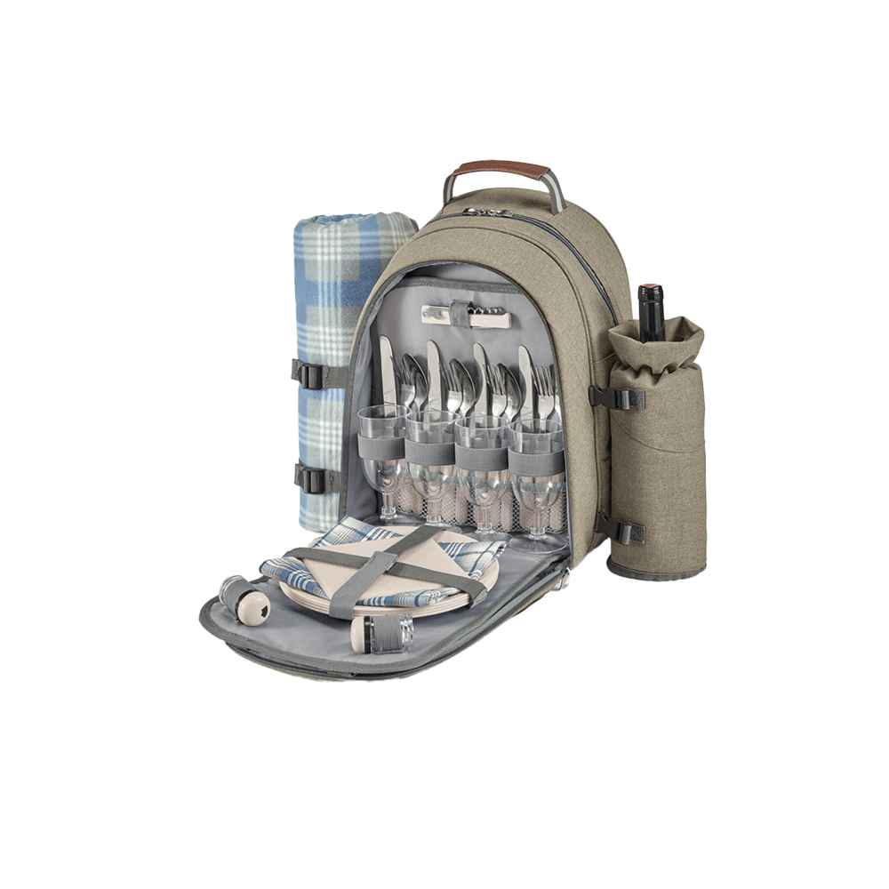 – CONTIENE: 1 coperta in pile 100% rpet foderato in polytex impermeabile (formato cm 150 x 135), 1 tasca termica portabottiglie imbottita (formato cm 30 x 10.5 Ø), 1 scomparto principale con chiusura a zip imbottito rivestito in alluminio termico isolante, 1 tasca frontale imbottita e foderata in polytex 210D con all’interno 1 porta utensili con 12 posate in acciaio inox, 4 piatti e 4 bicchieri in ABS lux per alimenti, 4 tovaglioli 100% cotone, 1 saliera e 1 pepiera, 1 tagliere in ABS TECH atossico, 1 cavatappi.